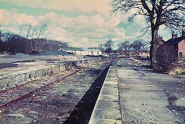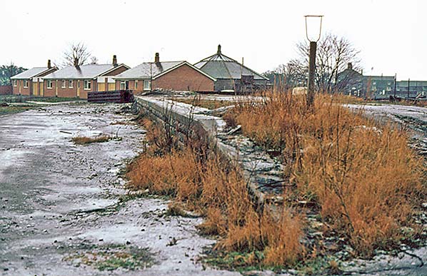 Photo by Bruce McCartney ![]() Looking south at Coldstream on 2 January 1976. The passenger station (site immediately beyond the left edge of this photo) has been demolished and a small residential estate is being developed which will eventually occupy the site of the station. The goods platform in the foreground is the last substantial part of the station to survive at this date together with a concrete post topped by a lantern cradle. The hexagonal roof belongs to the auction mart.