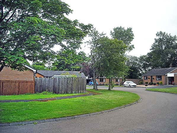 ![]() The site of Coldstream station in June 2011. The view is south-westwards into a cul-de-sac section of Station Gardens. The position of the photographer is approximately on the site of the down platform and the main building would have been in the road in the middle distance.