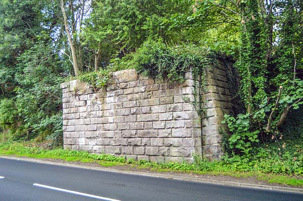 A bridge abutment where the railway formerly passed over the A697 at Coldstream station