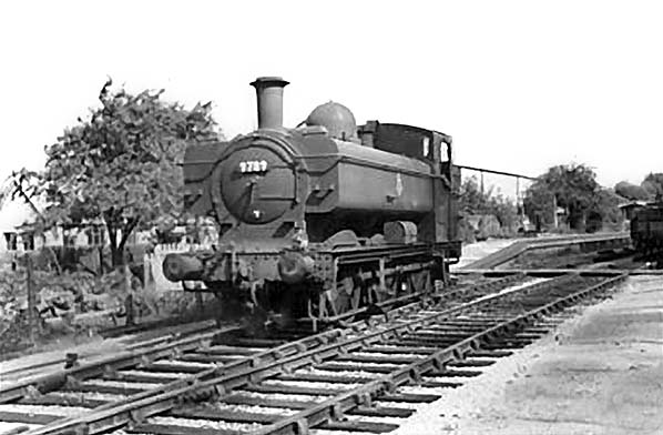 ![]() Carrying a class K branch freight headcode is 9789, an ex GWR 57XX pannier tank is seen on the up line at Colnbrook in the 1950s. This loco was built in May 1936 at Swindon works. After a service life of well over 29 years 9789 was withdrawn from 81F, Oxford shed in December 1965, and taken to Wards of Briton Ferry where it was cut up in April 1966.