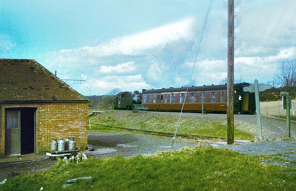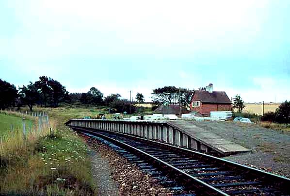 passenger trains using the down side of the former island platform. The signal box was also taken out of use and subsequently demolished and the up side platform edging was removed. A camping coach was placed at the end of the goods siding.