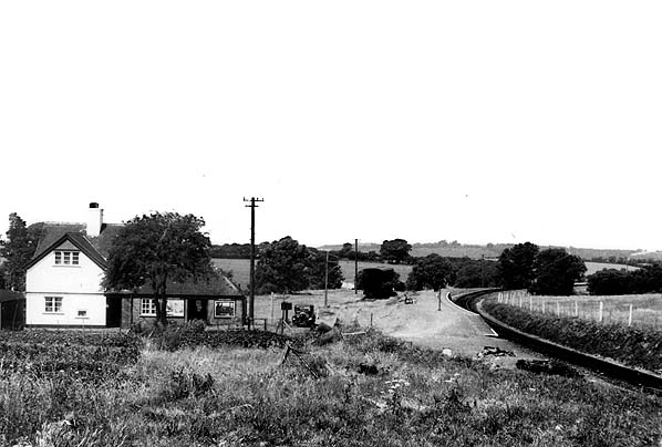 ![]() Station Name: COMPBYNE![]() Looking north towards Combpyne station from the road bridge in July 1959. The stationmaster's house and booking office are seen on the left. A camping coach stands at the end of the goods siding. Copyright photo by H C Casserley ![]()