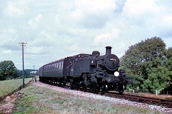 ![]() Station Name: COMPBYNE![]() A Lyme Regis train is seen on the sharp curve approaching Combpyne station in August 1961. 84022 was one of a class of 30BR2/2 built at Darlington works in 1957 to a design by Robert A. Riddles. It had a very short life being withdrawn to Crewe works in September 1964 where it was cut up a month later. Photo by Ron Fisher from his Flickr photostream ![]()