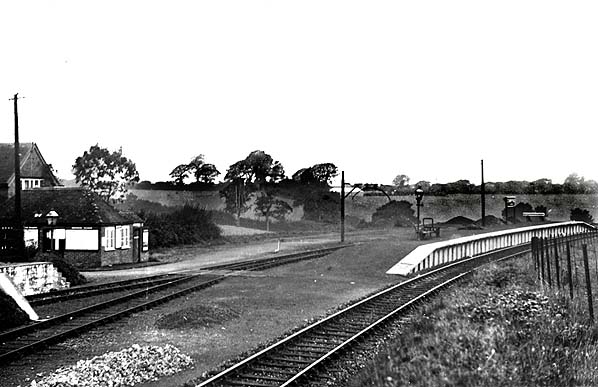 Looking north-west from the road bridge towards Combpyne station c1950s. The cattle dock, seen on the left, the was available for both side and end-loading