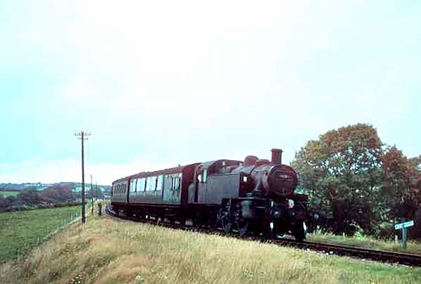 Lyme Regis train approaching Combpyne station in August 1963. The line changes direction from southerly to easterly at this point.
