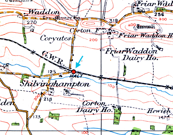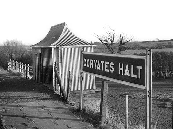 Coryates Halt was opened on 1 May 1906 following the introduction of the rail-motor service on the Abbotsbury branch the previous year. It was on sited on the down side of the line immediately east of the Cheese Lane bridge. Access was along a steep diagonal path up the side of the embankment from Cheese Lane.