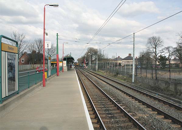 Looking east from Fawdon in April 2009. The eastbound platform is at the west end of the Coxlodge station site. Fawdon's westbound platform is on the other side of the crossing.