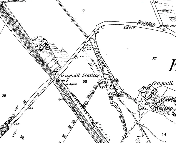 ![]() 1865 1: 2,500 OS map. The source of this map of Cragmill is the same survey as was used on the 1: 10,560 map. The larger scale permits the two main line railway tracks to be shown as well as two sidings into the coal depot, south-east of the crossing on the up side of the main line. The station name on this map is shown south-east of the level crossing. An early twentieth century ‘half inch’ Bartholomew’s map indicates that the passenger station was north-west of the level crossing'