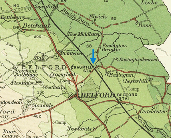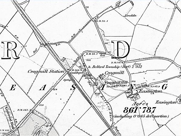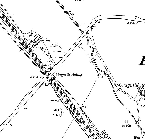 Photo by John M Fleming / NERA ![]() ![]() 1865 1: 10,560 OS map. Cragmill [sic] station is named, but no platforms are shown. The positioning of the name suggests that the passenger station was north-west of the level crossing and that it therefore adjoined the crossing keeper’s cottage. A coal depot is indicated south-east of the level crossing. There are a few isolated buildings and hamlets in the vicinity of the station which must have justified its opening but, it seems, insufficient population to make it worth providing a daily train service when it briefly appeared in the public timetable in the mid 1870s.