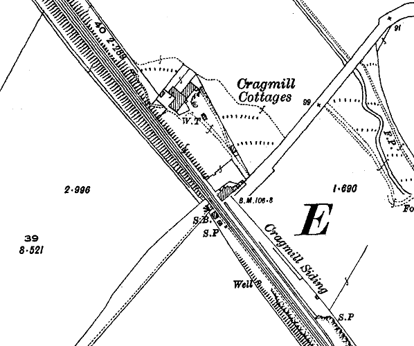 ![]() 1898 1: 2,500 OS map. Cragmill [sic] ceased to be a passenger station in 1877, and it is now referred to as Cragmill Siding. The signal box immediately south-east of the level crossing, on the down side, has been added. There appears to be an outline of a platform adjoining one of the sidings