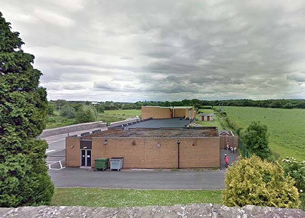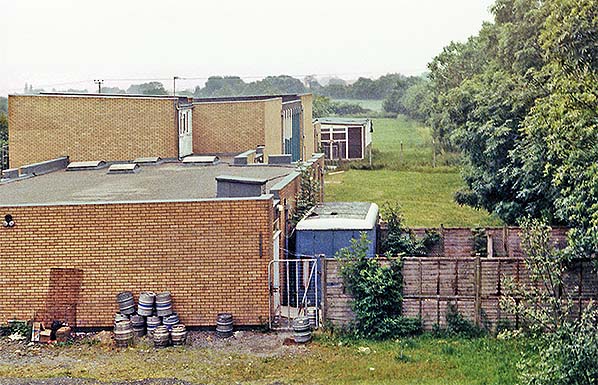 Looking south-east from Station Road bridge in June 1986. The Credenhill community hall, seen here, was built on the station site in August 1975.