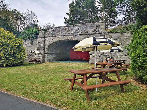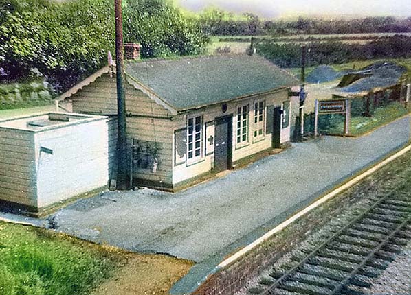 This is the first of six photographs taken by Mike Fergusson in the early 60s with a box camera. Mike's father was stationed at RAF Hereford at the time and Mike was a regular user of the line to visit friends in Hereford. This picture has been colourised and is seen from Station Road bridge. Stacks of coal are seen in the goods yard both on the ground and on the dock. The gents' toilet is seen to the left of the main station building.