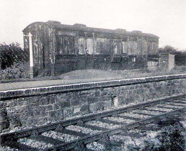 By the 1960s this vehicle had appeared at Credenhill. Some difficulty has been experienced when deciding if the vehicle is still wheeled or is grounded, but the conclusion is that it was grounded at the end of the goods dock given its position relative to other fixtures on the station platform. The vehicle is of some interest and despite the poor image quality something of its history can be identified. It is the body of a 6-wheel Full Brake, or Luggage Brake, of Glasgow & South Western Railway origin and would date from the very early years of the 20th century. Originally these vehicles would have worked in Glasgow to Stranraer and Carlisle trains. The LMS withdrew most from service during the 1930s but many soldiered on in engineering use, in some cases until well into the 1960s, and at least one has survived into preservation. The example which found itself at Credenhill no doubt found its way there by virtue of the LMS or perhaps its Midland Railway constituent