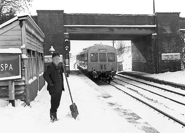 Porter George Lamb clearing the up platform as the 10.30 DMU leaves for Richmond in February 1969.