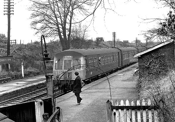 ![]() A DMU arrives at Croft Spa for Darlington on 1st March 1969, the last day of public service. Seen from the ramp down to the 'down' platform.