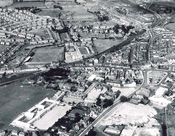 Aerial view of Crook in the 1960's. The station can be seen top right.