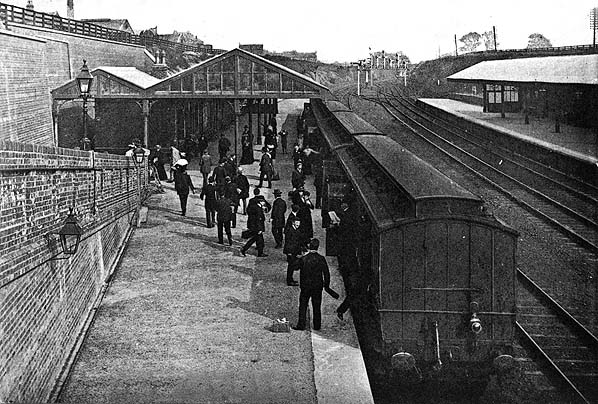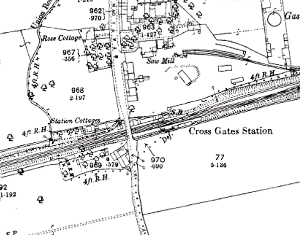 Cross Gates became a junction station on 1 May 1876 with the opening of the Leeds to Wetherby line, which ran from a junction just east of Cross Gates station. A new station at Cross Gates was authorised on 11 February 1870 at a cost of £807, but it was not built until the line between Neville Hill and Cross Gates was quadrupled in 1902. At this time, the station was completely rebuilt and re-sited slightly to the east. The new station possessed two wide facing, but slightly staggered, platforms, with two fast lines running between them. The booking office, a rectangular brick building with a hipped slate roof, was on the bridge on the down side from where two long ramps ran down to the platform. Halfway down the ramps were landings linked by a lattice bridge. Both platforms had pitched canopies supported on cast iron columns. The usual offices, waiting rooms and toilets were located below the canopies with four rooms on the up platform and six on the down. Existing station cottages on the west side of Station Road were demolished and replaced with a new terrace of cottages to the south of the station. The ’Station Hotel’ in Station Road was opened.