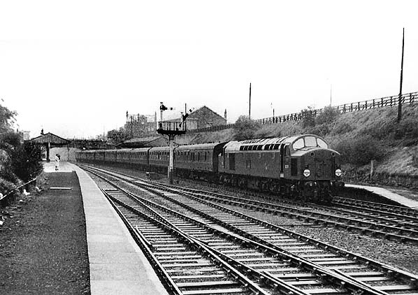 Class 40 D278 is signalled onto the Wetherby line with a Liverpool - Newcastle via Harrogate train in 1961, the first year of the Trans-Pennine workings.