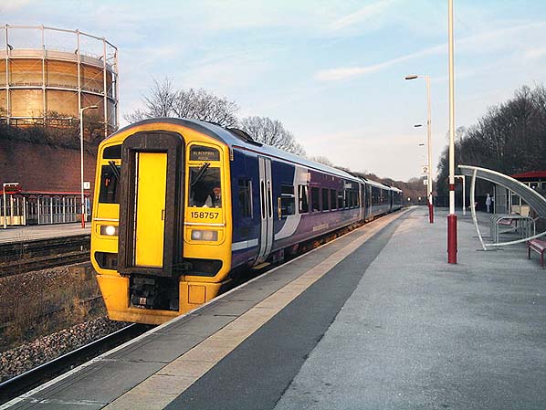 Northern Rail class 158 stands at the up platform at Cross Gates station working a York to Blackpool North service in March 2012.