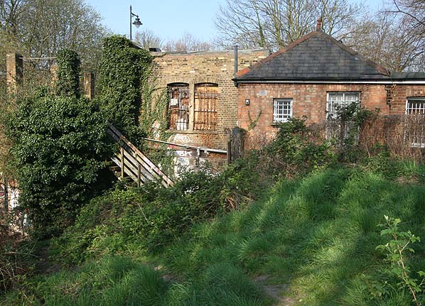 The rear of the Crescent Cafe and adjacent shop in April 2007 - these buildings appear to be contemporary with the station and are probably of railway origin.