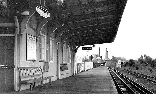 Looking east along Croxley Green station platform c. 1960s. he chimneys of Sun Printers Ltd,