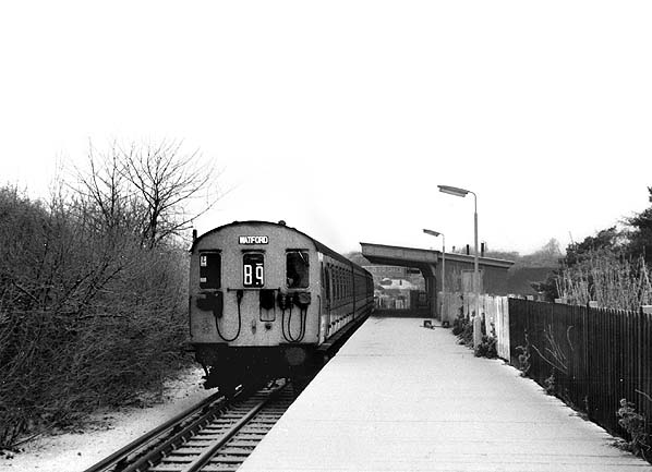 A class 501 EMU shuttle service to Watford Junction waiting to depart from Croxley Green station in February 1976.