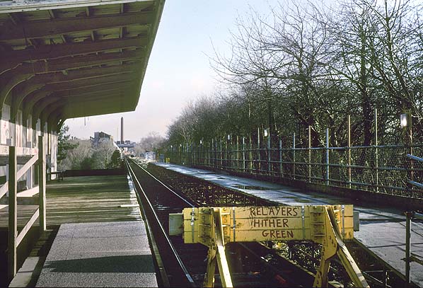 ![]() In the late 1980's the platform and buildings were in a dangerous condition and a temporary platform was provided on the opposite side of the track. In January 1989 demolition of the original platform and building is underway. Beyond the buffer stop new housing has been built on the site of the goods yard.