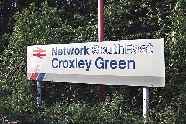 New sign on the temporary platform at Croxley Green station in June 1993.