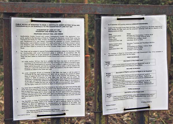 Statuory notices related to the Croxley Rail Link fixed to the station gate in February 2013.