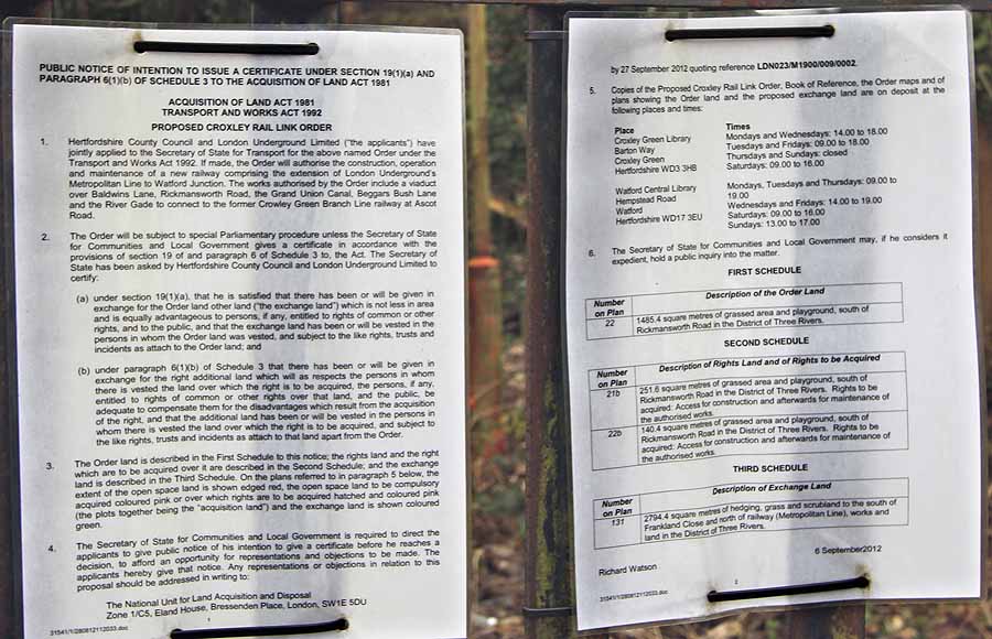 Statuory notices related to the Croxley Rail Link fixed to the station gate in February 2013.