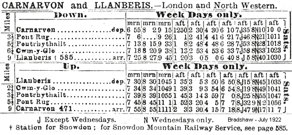 From July 1870 the line had become wholly owned by the LNWR. The summer timetable for 1887 showed six trains in each direction running between Caernarvon and Llanberis. Services were always fewer in the winter months: the December 1895 timetable showed four trains in each direction running between Carnarvon and Llanberis. In 1897 the Snowdon Mountain Railway (SMR) opened which brought excursion trains to the line but they mostly ran fast through Cwm-y-glo and served only Llanberis. Excursion trains did also run from the line and served the station.