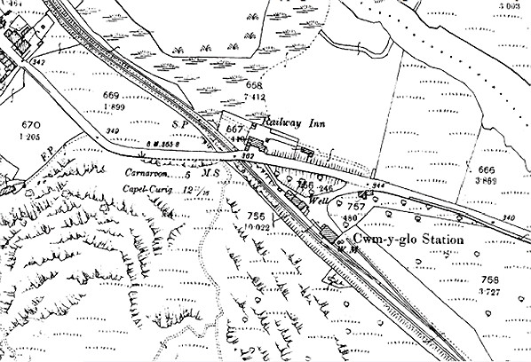 Notes: Cwn-y-glo was located on the Carnarvon & Llanberis Railway (C&LR) which was authorised on 14 July 1864. The line initially ran from Carnarvon Morfa to Llanberis and was 9 miles in length. Although the first sod was cut on 15 September 1864 progress was slow as the C&LR struggled financially from the start. During the 1866 financial crisis work on the line stopped completely. The London & North Western Railway (LNWR) offered to buy and complete the line using the threat of an alternative Bill as leverage. A compromise was reached the LNWR gaining 4½ miles of the line at the Llanberis end and running powers over the rest. Work began again and on 13 December 1866 there was agreement that the line should be jointly C&LR and LNWR. The branch opened for goods and passenger services on 1 July 1869.