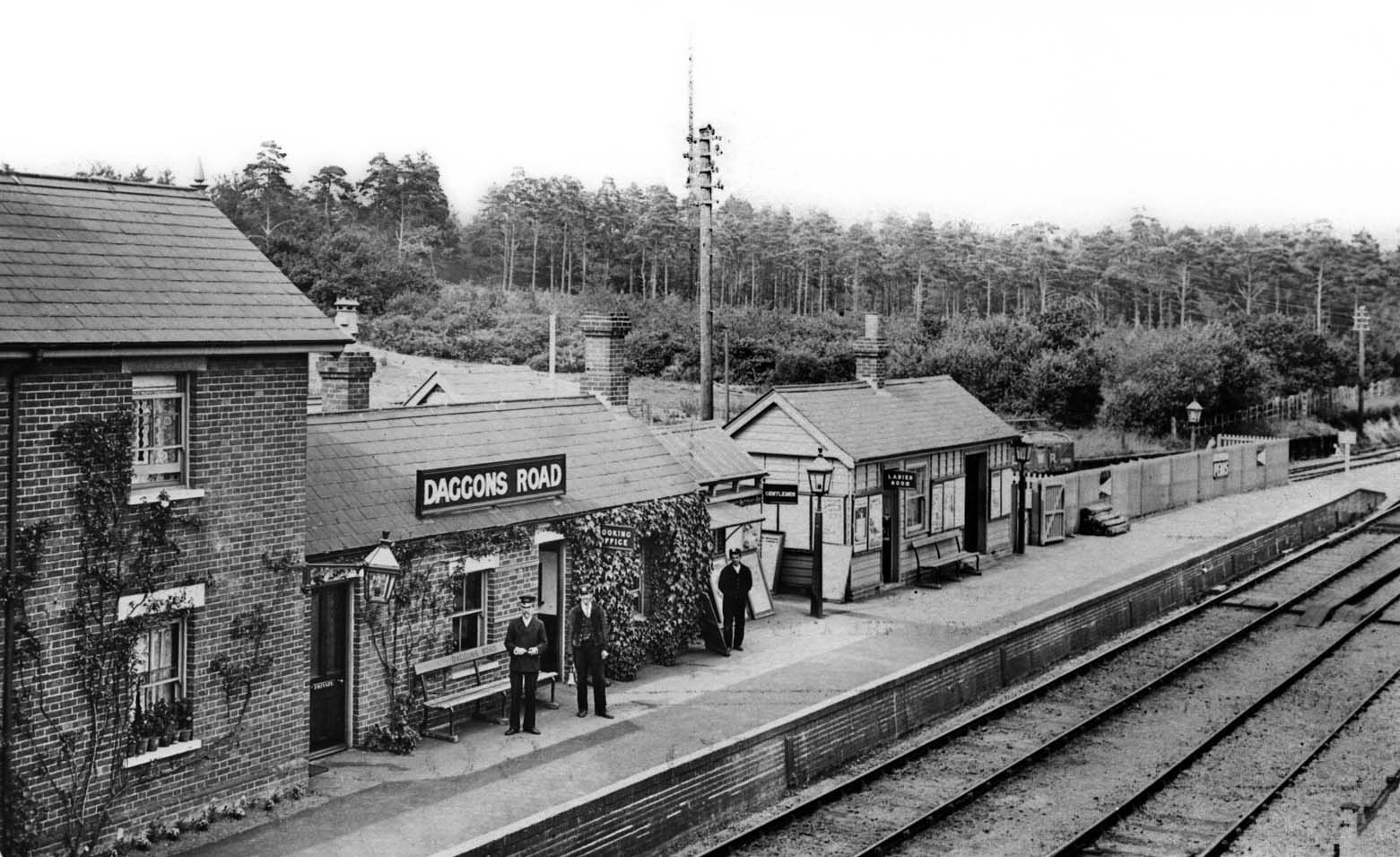 A rather delightful view of Daggons Road station, showing the aloof running-in board, before July 1906 (date of postmark). The spelling of the station was changed from 'Daggens' to 'Daggons' in 1904 as shown on the nearest platform bench. A number of noticeboards can be seen leaning against the platform buildings. As there is no room to mount additional boards and they already bear posters it must be assumed the loose boards were publicising some form of special event, excursions perhaps. The booking office is brick built and co-joined the station house. There was a second such structure behind the booking office, also co-joining the house and its chimney is visible to the immediate right of the house. This was probably a goods office. A third, smaller, building is visible in the background but its purpose is unclear. Of the two post-mounted platform lamps, that nearest the camera is mounted on what was probably a wooden post while that further along has a cast iron post. The third lamp, on the dock behind the fence, would appear to also have a wooden post. In later years all these lamps would find themselves mounted upon old sections of rail. Just beyond the end of the platform and to the left the points which led to the dock behind the platform and to the brick and pottery works can be seen, the latter located well out of view to the left. On the brick and pottery siding stands a LSWR open wagon. It has round-top ends but does not appear to be a tarpaulin wagon. The LSWR had a fleet of both types, the non tarpaulin versions, which could nevertheless still be sheeted, being to Diagram 1309. The wagon has a five-digit number beginning '14' but the remainder is illegible. The livery of the station at this time was probably as follows: doors and metalwork dark brown, wood planking cream or salmon, window frames white, noticeboard frames would have been brown with the heading, if present, in cream with LSWR lettering in black while cast iron signage, such as that at the platform end, was white with red lettering. None of the noticeboards seen here appear to have the LSWR heading. The livery of other signage, such as the running-in board, is unclear and could have been cream, salmon or white letters on a brown or black background. Detail of the bench nameplate is none too clear, if it is a plate at all. From what can be seen it comprises either letters fixed directly to the bench or, but unlikely, simply painted directly onto the bench. Either way the colour of the letters was most likely to be red
