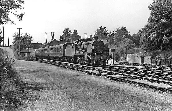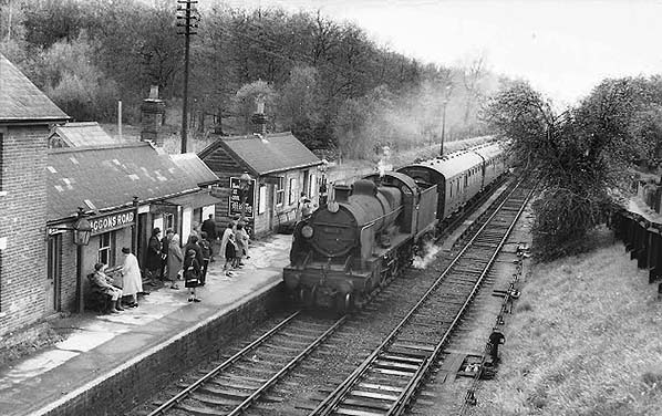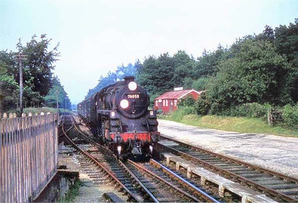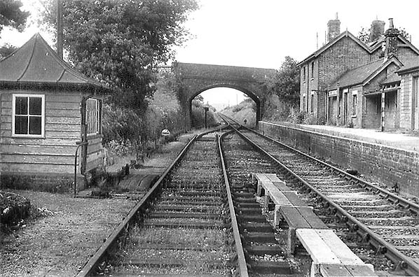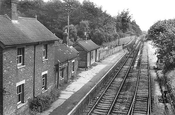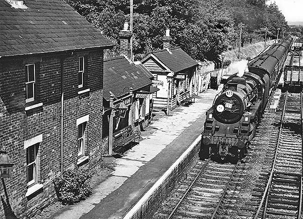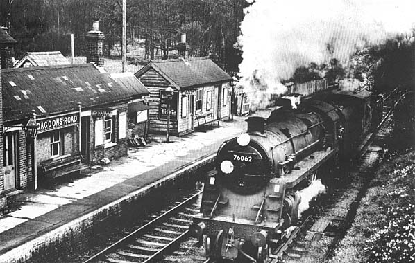 Summer 1964 - Summer 1964 ![]() Sometime during the last decade prior to closure an unidentified BR Standard Class 4 2-6-0 passes Daggons Road. The Southern Region's share of this 115-strong class generally had the larger BR1B tender as seen here. The headcode disc positions indicated Salisbury to Bournemouth West via Wimborne, or vice versa, but was also carried by through trains using this route and not necessarily serving Bournemouth West. This is one such train, as indicated by the additional regalia attached to the smokebox door. A number of these trains operated on summer Saturdays between Cardiff or Swansea to destinations in the Bournemouth and New Forest area. The photograph shows Daggons Road station to have been in something of a time warp, a not uncommon situation with rural stations at that time. Only the running-in board shows any hint of modernity while all other signs that are visible have long since seen better days. The platform was oil lit and would remain so until closure. The darker section of wall on the station house is merely a shadow, the photograph being taken when the sun was almost directly overhead. On the right, what had been a single-ended siding, known as the Down Siding, had been converted to a loop, a passing loop according to some sources, in 1904. No doubt of some use when goods trains were operating, the loop doubtful saw much use for crossing passenger trains, if indeed that was the intention, as Daggons Road only ever possessed one platform. As the photograph suggests the loop saw more use as a double-ended siding, at least during later years, this being further evidenced by the provision of a walkway for staff, between running line and loop, covering point rodding. Daggons Road signal box, a small almost hut-like affair, stood out of view to the right adjacent to where the point rodding passes beneath the track. The box had been downgraded to ground frame status in 1903 and was never a Block Post. After 1903 only shunt signals were provided, despite the OS six inch map published in 1911 suggesting to the contrary but this map would have been surveyed some years previously. The points at bottom right led only to a short headshunt, in effect trap points. There was a longer headshunt at the other end of the loop, upon which in this view some mineral wagons are stabled. Not obvious in this photograph due to the presence of the train, points, facing in the Up (away from the camera) direction, connected to further sidings on the west side of the station (left). There was a dock behind the platform, to the left of the first two carriages, while another siding served a brick and pottery works located roughly behind where the mature trees can be seen.