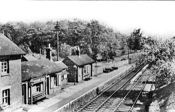 Photo from John Mann collection ![]() A view of Dagons Road station looking north west from the track circa late 1950s. A half hearted attempt to brighten the station up with flowers is note. The booking office is located to the right of the running-in board. The gents' toilet is between the two single storey buildings, The furthr building is the ladies' waiting room.