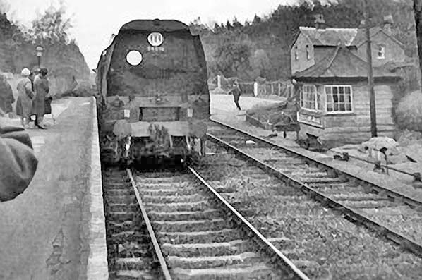 Photofrom James Lake collection ![]() Bulleid Light Pacific No.34092 'City of Wells' arrives at Daggons Road with a service in the Bournemouth direction. The period will be between May 1961 and closure. The rather quaint signal box, long since demoted to ground frame status, is visible on the right. A few passengers are waiting. The locomotive is in what OVS Bulleid referred to as 'Air Smoothed' form. giving rise to the almost universally used nickname 'Spam Cans'. They had a number of typically Bulleid pecularities and many were rebuilt into conventional form, but 'City of Wells' was among several to retain original form. Withdrawn in November 1964 from Salisbury shed, she has survived into preservation. 'Pacific' refers to the 4-6-2 wheel arrangement and although these locomotives were not rare on the Salisbury & Dorset Junction line they were by no means an everyday sight. Far more common were 4-4-0 and 2-6-0 types, as other photographs illustrate.