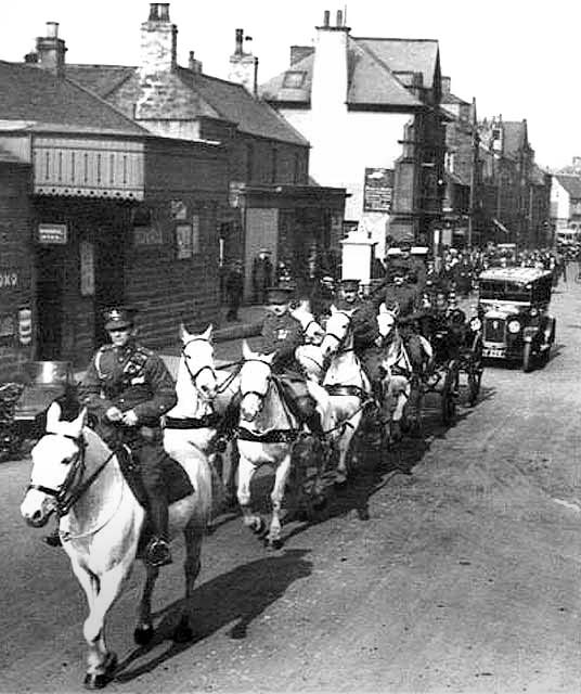 A wedding procession passing Dalkeith station c 1930. The carriage is drawn by six grey