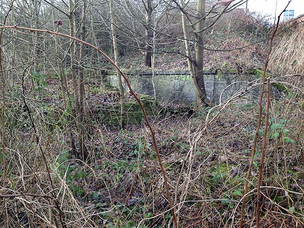 The retaining wall at the rear of Daresbury station down platform seen in February 2013.