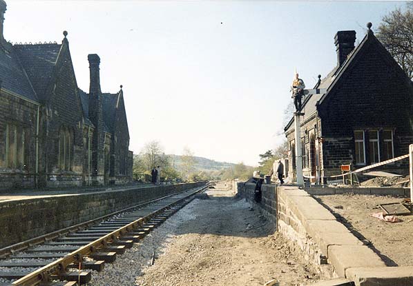 Darley Dale station during the initial stages of tracklaying with one track roughly in position in 1990.