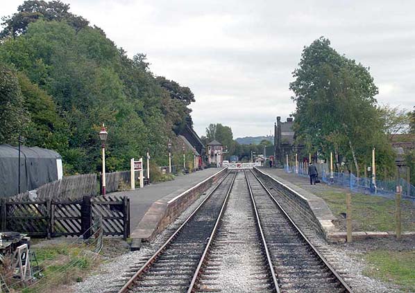 Looking south from the north end of Darley Dale's second station in September 2009. The signalbox in the middle distance has been erected by Peak Rail. The original was on the other side of the level crossing. Darley Dale's first station was also on the other side of the level crossing.