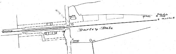 A contemporary sketch this time showing the new Darley station of 1873, with the 'Dale' added. It was certainly drawn before the early 1880s as it includes Darley North and South signalboxes. The later was closed c.1882. Darley North box was originally known as Darley Station. It was altered to Darley North c.1879, but reverted to Darley Station when the South box closed. It appears that the North box name entry is an alteration, perhaps indicating that the box was originally identified on the sketch as Darley (Dale) Station, but was altered following the c.1879 renaming. The station platforms were extended northwards in 1900 at a cost of around £800.