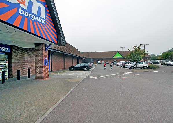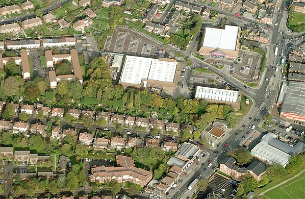 Photo by Nick Catford ![]() The line of trees running from east - west is on the south side of the station and hides a public footpath running west from Mansfield Road. The Madford Retail Park covers the up platform and the main station building. The large building in the centre is Homebase, and it is on the site of the station building. The car park is on the site of the Be-Ro flour mill. The Longdale Road housing estate to the left is on the site of the west end of the station and the goods yard