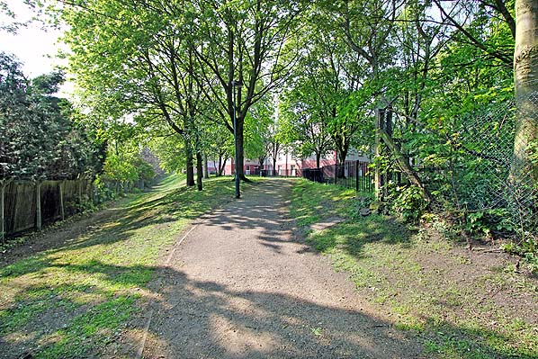 Photo by Ian Baker ![]() Looking east at the site of Daybrook station in April 2011. The public footpath runs along the south side of the station; the south side of the embankment is seen on the left. The up line, platform and station buildings are out of view to the right under a Homebase store.