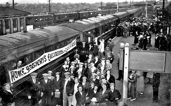 ![]() Home Brewery workers pose for the photographer before boarding a works outing to Skegness in 1933. Passenger coaches, perhaps a second excursion train, are standing in the siding