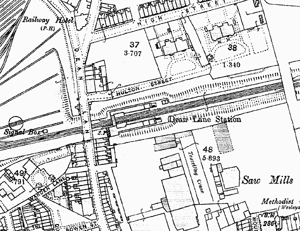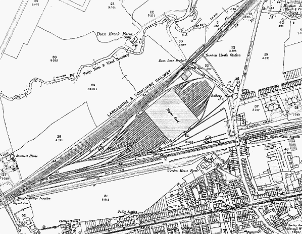 Notes: Dean Lane (Newton Heath) station was opened by the Lancashire and Yorkshire Railway (LYR) on 17 May 1880 as part of the Thorpes Bridge Junction to Oldham Werneth line. The purpose of the line was to provide a direct route from Manchester to Oldham avoiding the steep incline on the existing LYR line that provided a route to Oldham via Middleton.