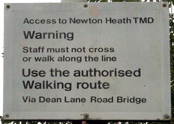 ![]() Dean Lane station lies very close to Newton Heath Traction Maintenance Depot. This sign was put up at Dean Lane station to stop railway staff from taking a short cut to the depot by walking along the line. Photo by Bevan Price
