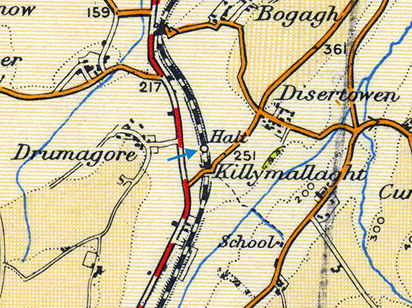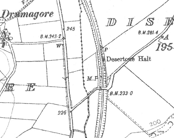 Notes: Desertone Halt was opened by the Midland Railway (MR) in 1907 to serve the small settlements of Drumagore, Killymallaght and Disertowen in County Londonderry Ireland. It was situated on the 14½ mile single track Strabane – Londonderry Victoria Road line which had been opened on 1 August 1900 (for goods with passenger services starting on 6 August) by the Donegal Railway (DR). The MR had been the owner of the line since 1 May 1906 when they had taken over the DR in partnership with the Great Northern Railway Ireland (GNRI) and formed the County Donegal Railway Joint Committee (CDR). Although the line between Strabane and Victoria Road was wholly owned by the MR the train services were operated by the CDR.