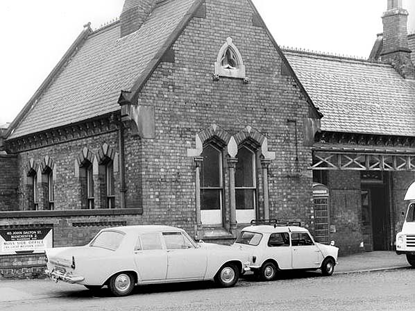 Didsbury Station at street level shortly after it had closed as a passenger station in 1967. The station signs had all been removed.