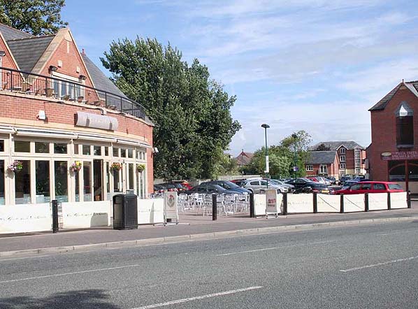 ![]() Looking towards the south east across Wilmslow Road. A public house which is located on west side of the bridge parapet, occupies part of the station site. The main Station buildling would have been located on what is now the car park. The vegetation marks the site of the line.