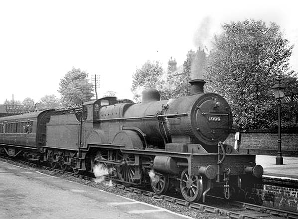 A southbound passenger train starts away from Didsbury Station in LMS days.